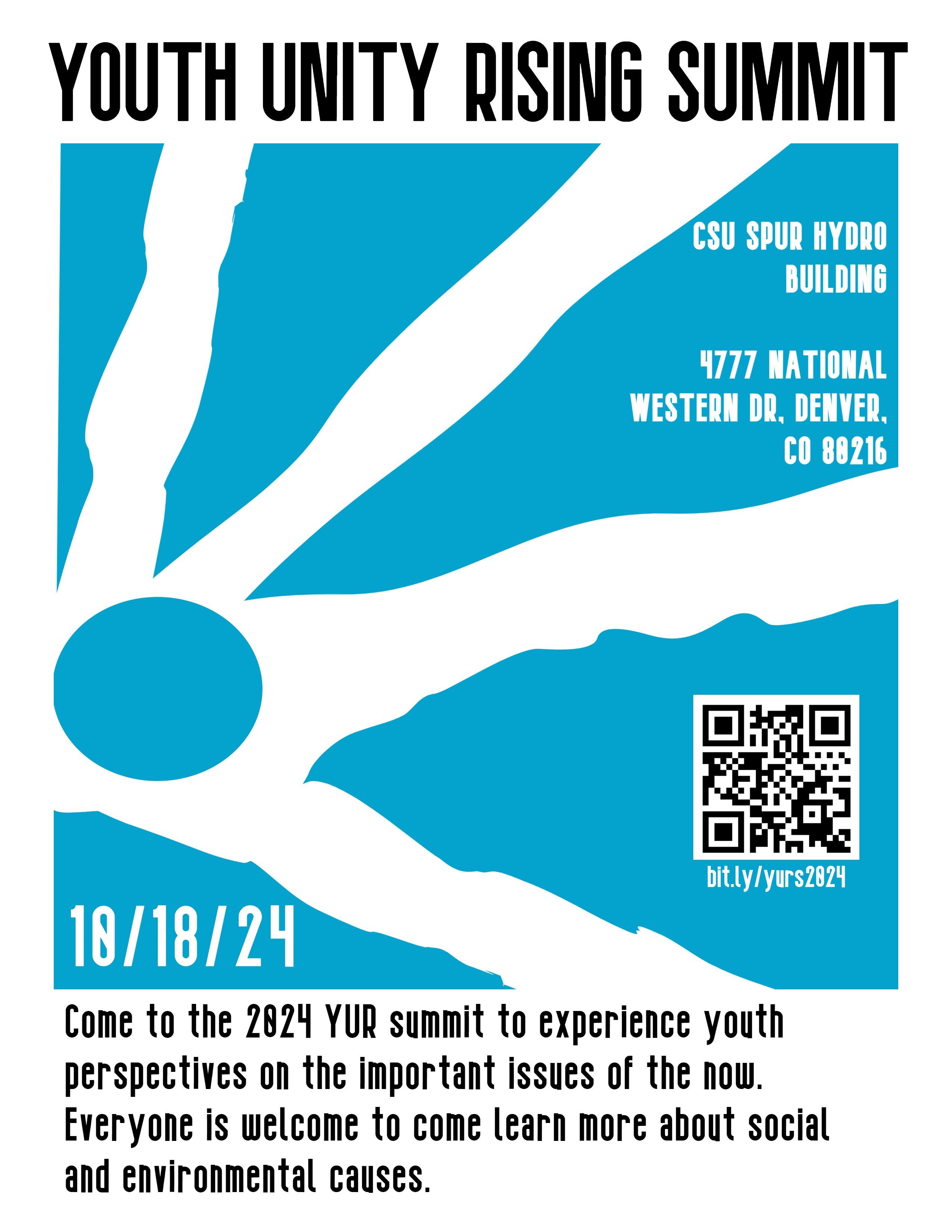 Join us for a day of empowerment and unity at the Youth Unity Rising Summit on October 18th, 2024, at CSU Spur - Hydro. This event is designed for high school-aged youth in Colorado, offering immersive learning experiences through student-led workshops, valuable resources, and an engaging panel discussion featuring youth leaders. The summit aims to mobilize young leaders to advocate for climate action and social justice, engage in stewardship projects to protect the environment, and foster community healing.
