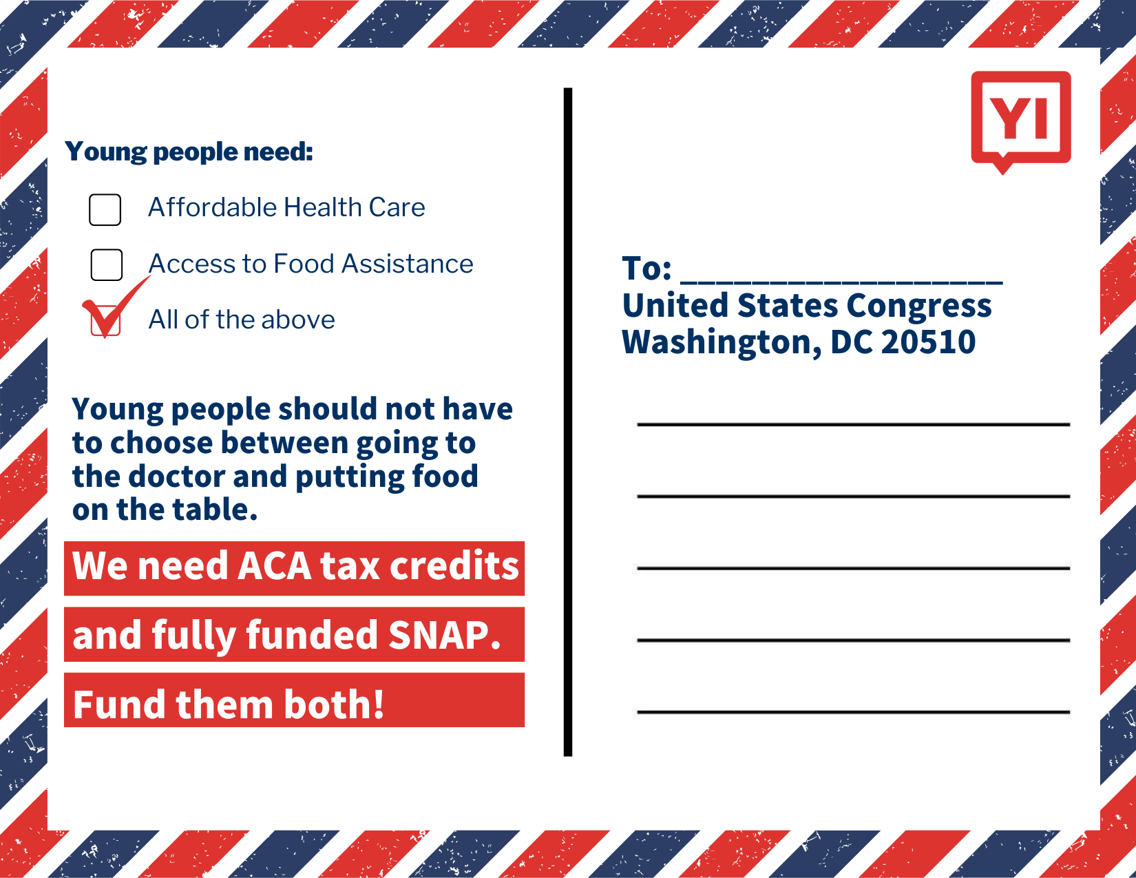 Send a virtual postcard to Congress asking them to end the shutdown, fund SNAP, and extend the health care credits.