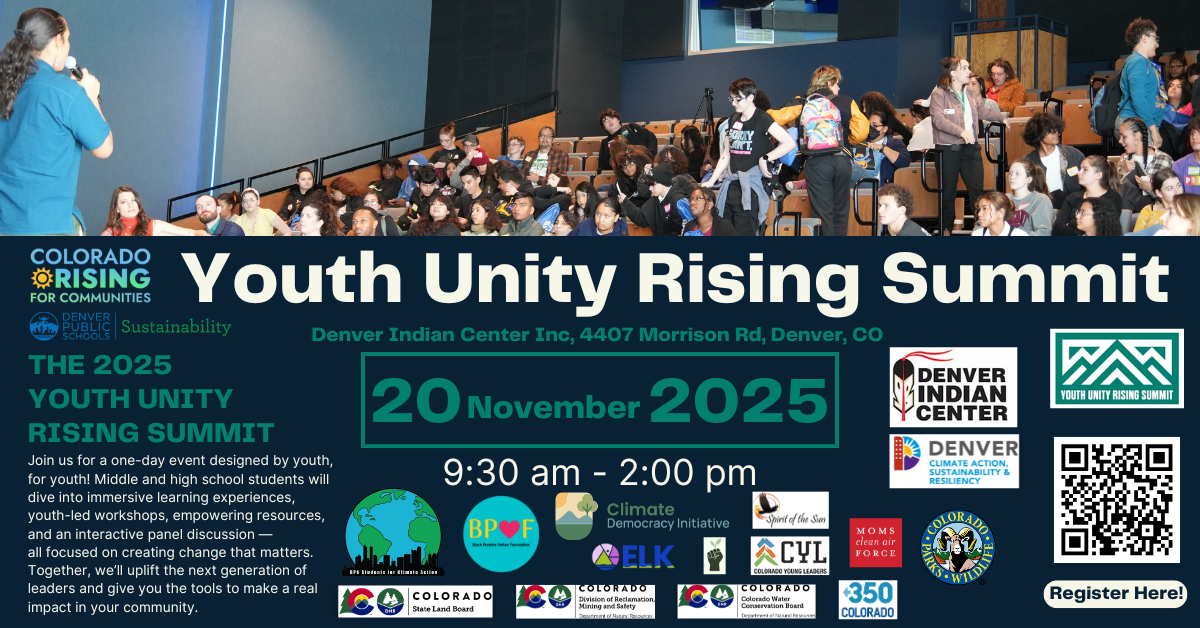 Join us for the 3rd Annual Youth Unity Rising Summit — a one-day event designed by youth, for youth to build leadership, strengthen advocacy skills, and inspire collective action across Colorado. Middle and High School students will engage in youth-led workshops, hear from inspiring speakers, and collaborate on creative solutions for a more sustainable, equitable future.This summit is a powerful opportunity for students to connect with peers, explore pathways for advocacy, and develop the confidence to create meaningful change in their communities.