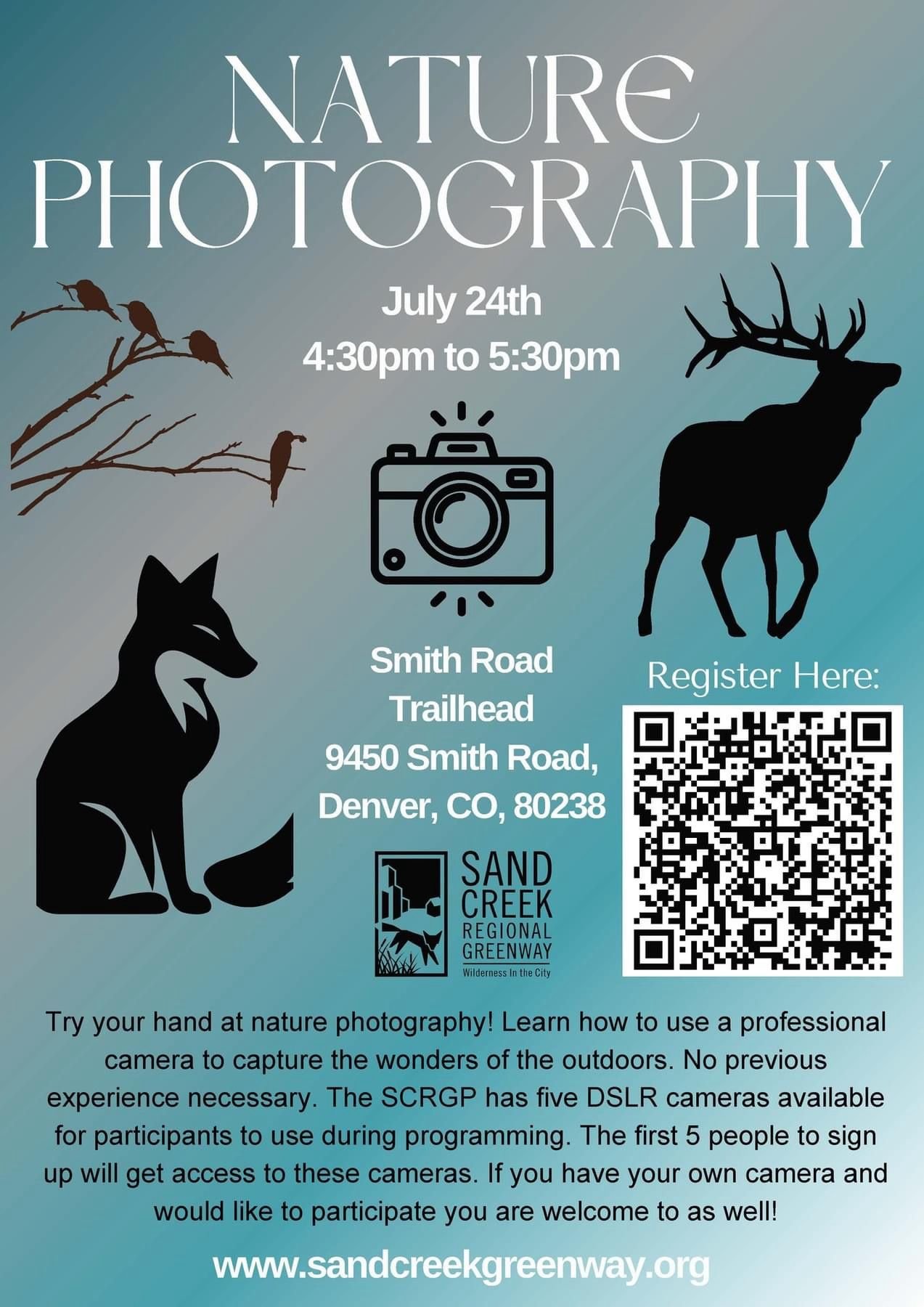 Join the Sandcreek Regional Greenway Partnership and ELK's Events & Marketing Coordinator, Lauren Keller, for a fun, educational, and relaxing afternoon of photography along Sand Creek Greenway! Spanish translation will be provided, and all ages are welcome. See you there!